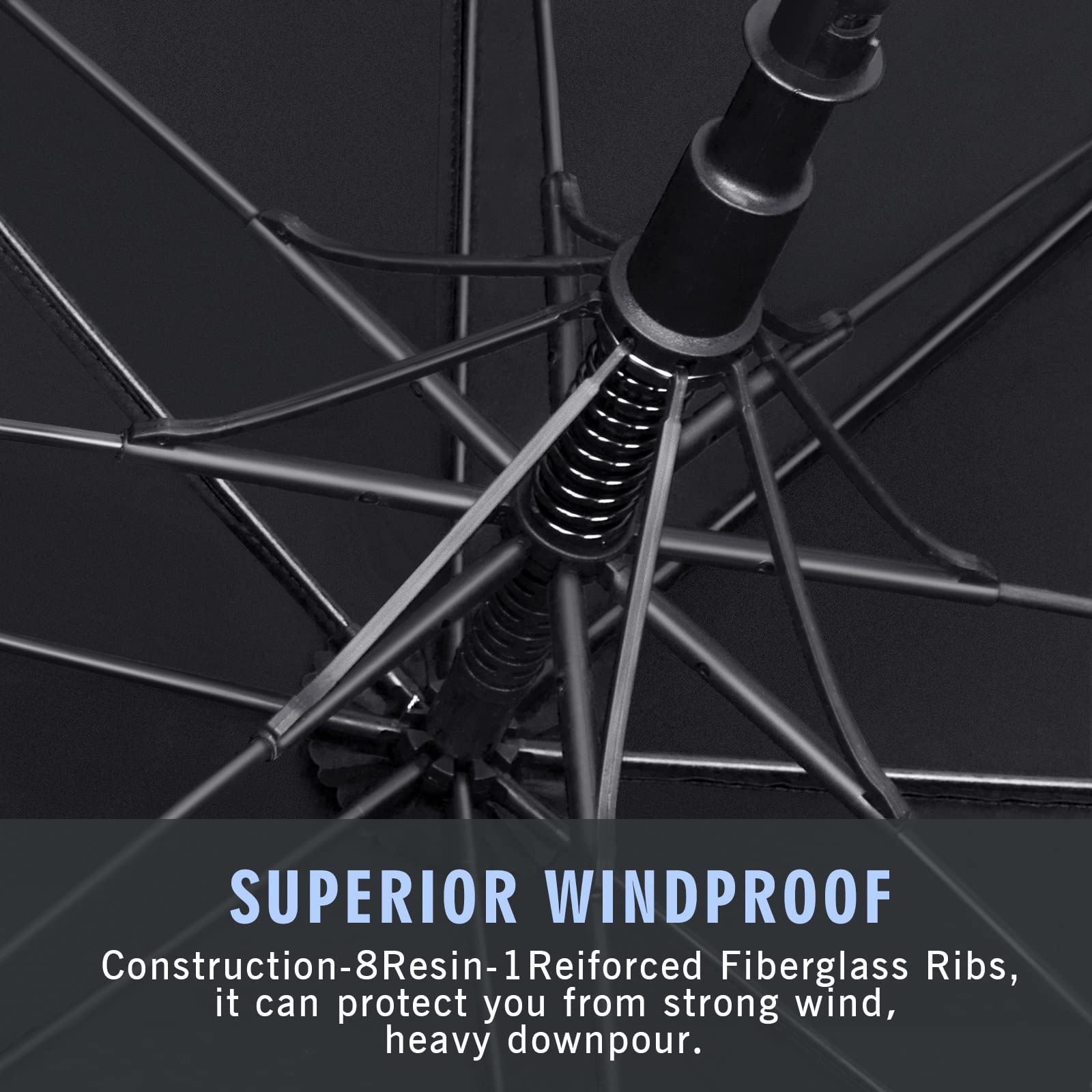 This umbrella features an excellent windproof structure with reinforced fiberglass ribs, providing superior protection against strong winds and heavy downpours.